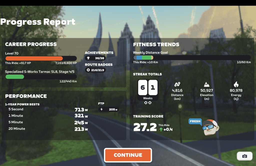 Allereerst zie je je level, hoeveel xp je net hebt verdiend met je rit en wat je nodig hebt om een level te stijgen. Daaronder zie je op welke fiets je hebt gereden en hoe ver je bent voor de volgende upgrade voor die fiets. Rechts van deze twee stats zie je ook het aantal achievements en het aantal Route Badges dat je hebt verzameld. Handig voor als je, net als ik, die het liefst compleet wilt hebben.