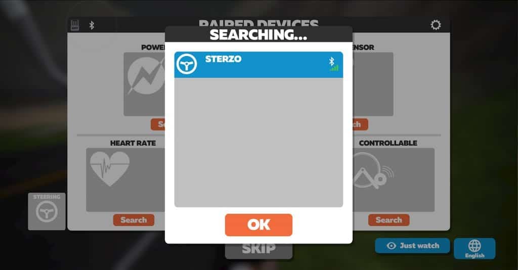 Je koppelt de Elite Sterzo Smart namelijk via Bluetooth met Zwift zelf en niet met de fietstrainer. Als je computer geen Bluetooth heeft, kun je de Sterzo ook via de Zwift Companion App verbinden. De Sterzo heeft ANT+-functionaliteit, maar voorlopig kun je alleen met Bluetooth verbinding maken. Zwift verwacht later dit jaar wel ANT+ te kunnen ondersteunen.