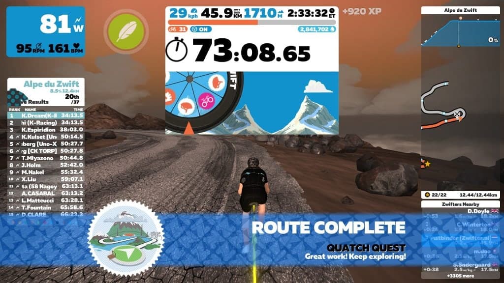 Je kunt natuurlijk eeuwig geduld hebben om level 100 te bereiken. Maar wie een beetje slim aan de slag gaat komt er een stuk sneller. Zo krijg je voor het halen van sommige route achievements extra XP. Naast de routes kun je ook extra xp verdienen door het halen van badges. Die kun je krijgen voor bijzondere prestaties of voor het halen van soms pittige uitdagingen. Denk hierbij aan dingen zoals 5, 10 of 25 rondjes rond de vulkaan, of 5 of 25 keer Alpe du Zwift op. Allemaal extra XP waardoor je extra snel in level stijgt.