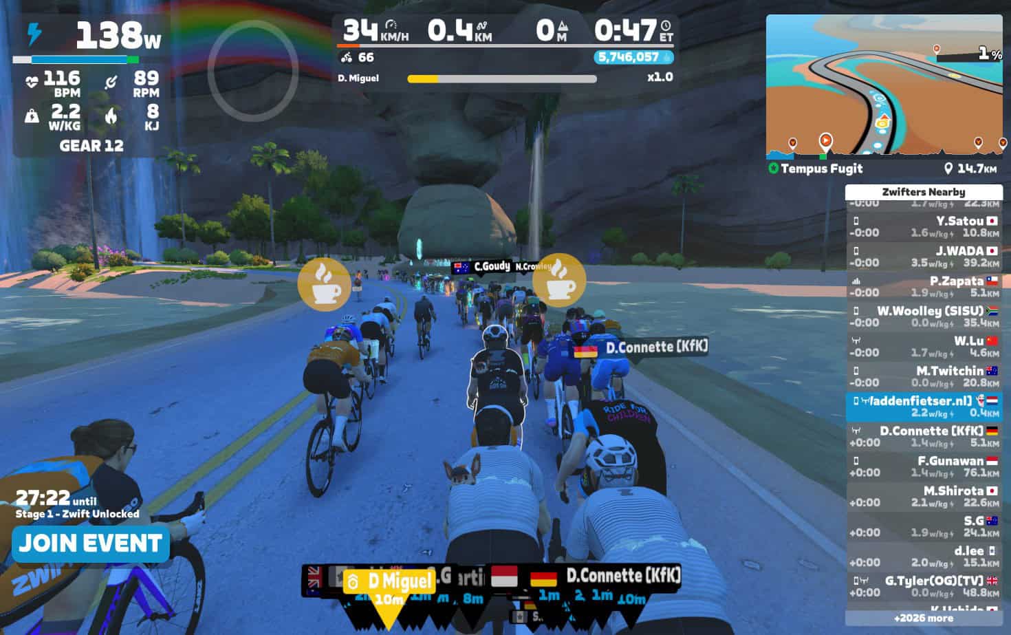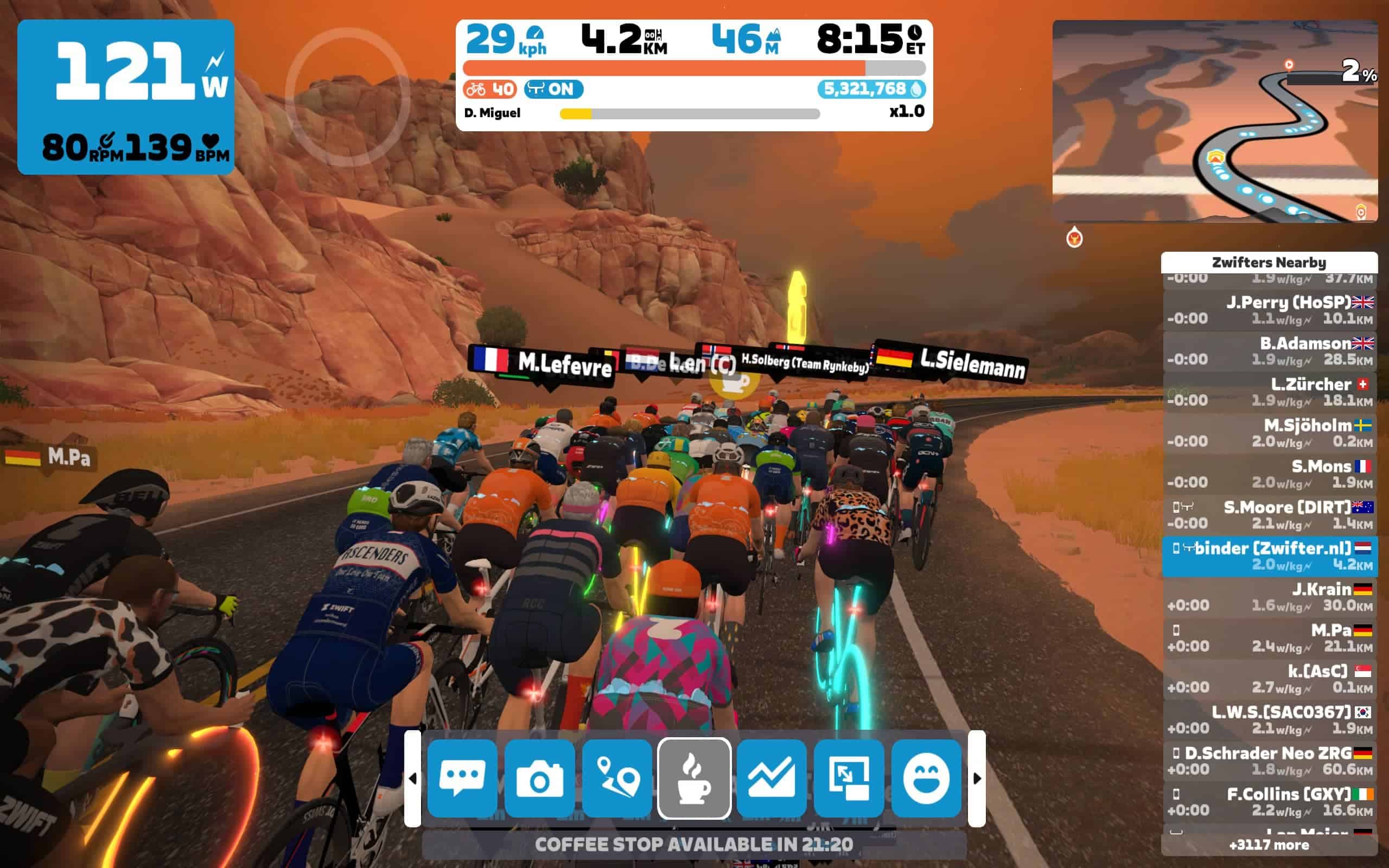 Daar heeft Zwift de Coffee Stop voor. Met een druk op de knop blijf je, zonder te trappen, 3 minuten bij de groep waar je op dat moment bij fietst. Zwift zorgt ervoor dat je automatisch bij de groep blijft. Jij kunt dus even afstappen en koffie pakken, naar de wc rennen, een vergeten bidon of verse handdoek pakken of gewoon een paar minuten rust pakken als het tempo in de groep even te hoog is.