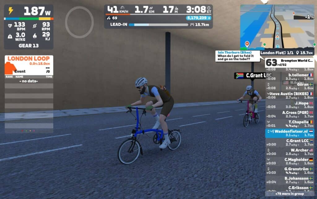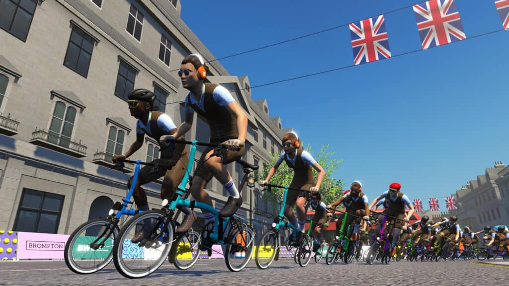 Het WK Brompton op Zwift wordt met net zo’n knipoog georganiseerd als het echte WK. Het gaat vooral om de lol. Het rondje, van dik 11 kilometer op de route Greater London Flat. is geschikt voor iedere Zwifter. De Brompton waar je tijdens de events op fietst en die je ook daarna nog kunt aanschaffen in de Drop Shop is de Brompton P Line. Dit is een bestaand high-end model van Brompton dat in het echte leven verrassend snel is. In Zwift zijn de prestaties vergeleken met de andere fietsen niet erg goed, dus daarvoor hoef je hem niet aan te schaffen. Je moet wel minimaal level 10 zijn om de Brompton te kunnen kopen.